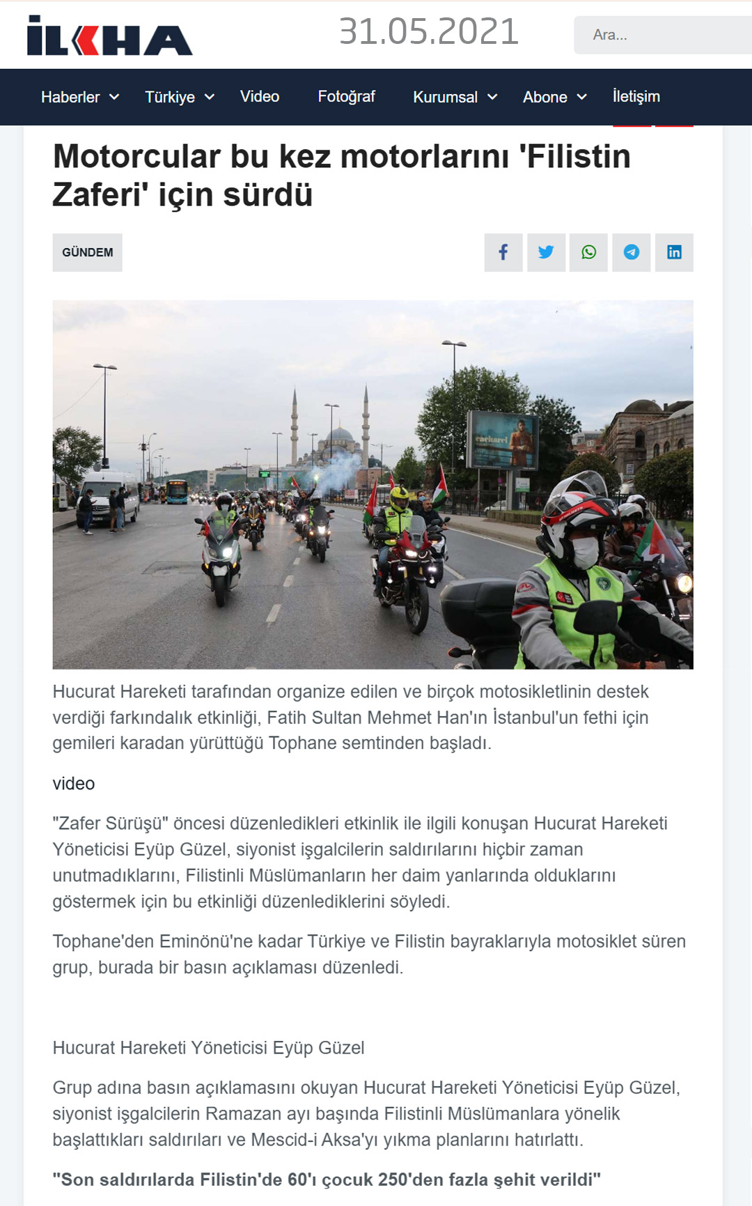 31.05.2025 tarihli İLKHA'nın haberi "Motorcular bu kez motorlarını 'Filistin Zaferi' için sürdü" başlığıyla verildi.